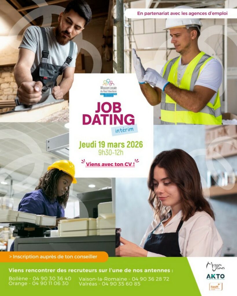 La Mission Locale du Haut Vaucluse organise un Job Dating sur ses quatre antennes : Bollène, Orange, Vaison-la-Romaine et Valréas. L’occasion de rencontrer des recruteurs et booster ses chances d’embauche !