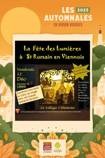 En l’occasion de la Sainte Lucie, le village illumine ses maisons ! Ce sera également la soirée « Finale des Automnales ». Bougies ou guirlandes lumineuses aux fenêtres, cortège d’ouverture avec les enfants à la lueur des lampions dans les ruelles. Spectacle de feu. Soirée artistique (exposition de créateurs autour de la place et dans l’église) et familiale pour se retrouver au cœur du village illuminé et partager ensemble une dernière soirée Automnale et une belle veillée de Noël ! Marrons grillés offerts par la commune et toutes consommations à 1€ !