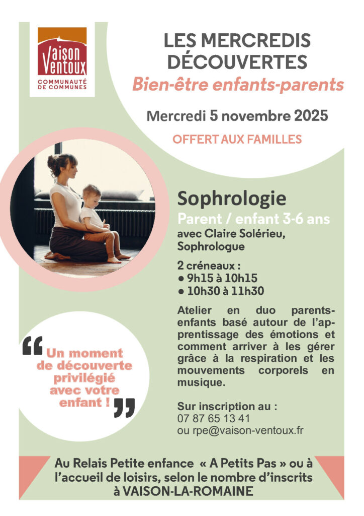 Dans le cadre des « Mercredis découvertes », qui s’inscrivent dans le dispositif intercommunal de soutien à la parentalité, la communauté de communes propose aux familles un atelier 𝘀𝗼𝗽𝗵𝗿𝗼𝗹𝗼𝗴𝗶𝗲 𝗽𝗮𝗿𝗲𝗻𝘁-𝗲𝗻𝗳𝗮𝗻𝘁 𝟯-𝟲 𝗮𝗻𝘀 :